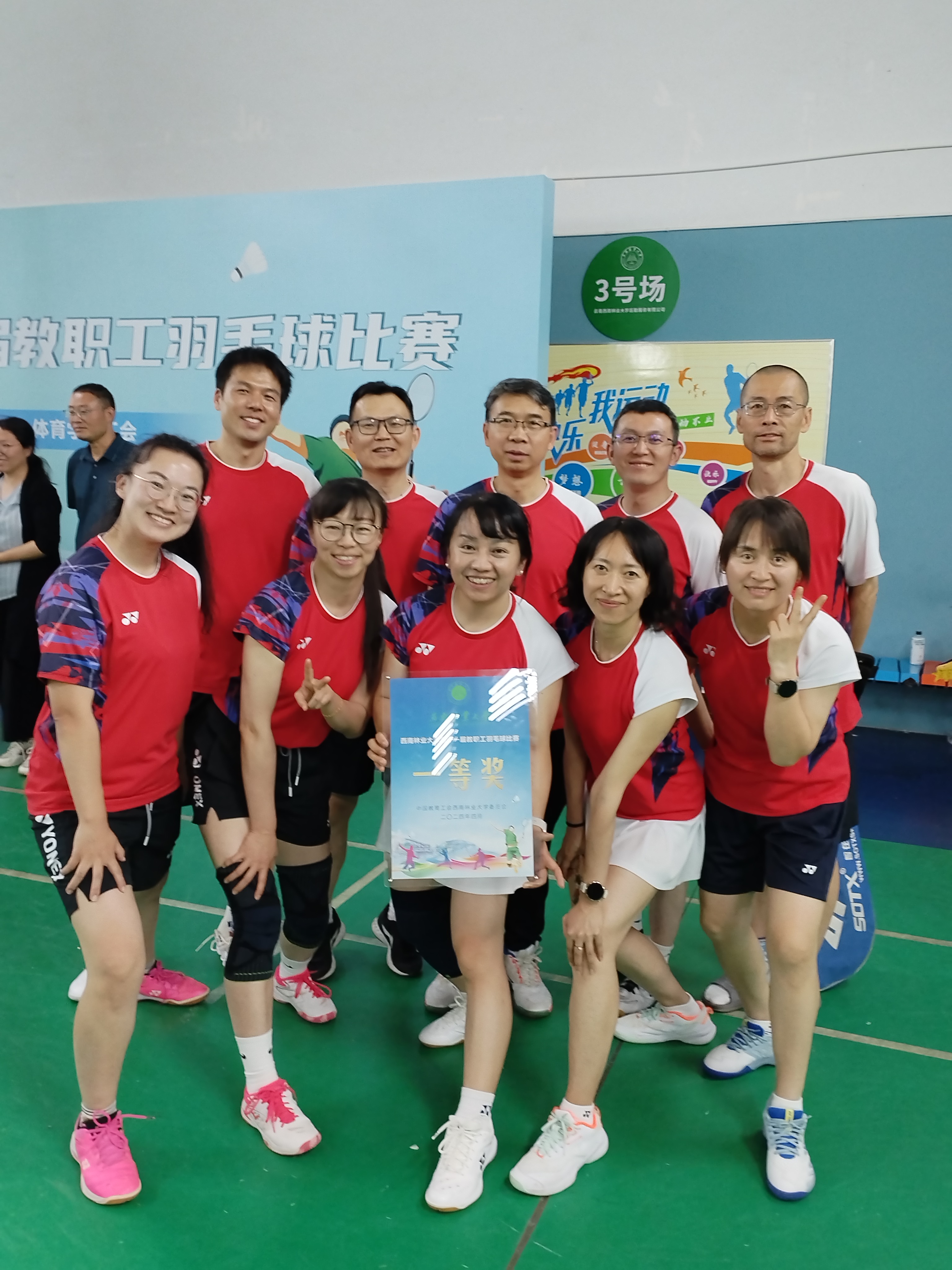 4月26日,9728太阳集团第十一届教职工羽毛球混合团体赛在羽毛球馆落下帷幕。经过27场激烈鏖战,梁志宏经理担任队长的大智一队经过全体队员的齐心协力、奋勇拼搏,勇夺9728太阳集团第十一届教职工羽毛球混合团体赛冠军,此奖项为公司羽毛球队继获得第九届、第十届校羽毛球赛冠军后的第三个连冠。