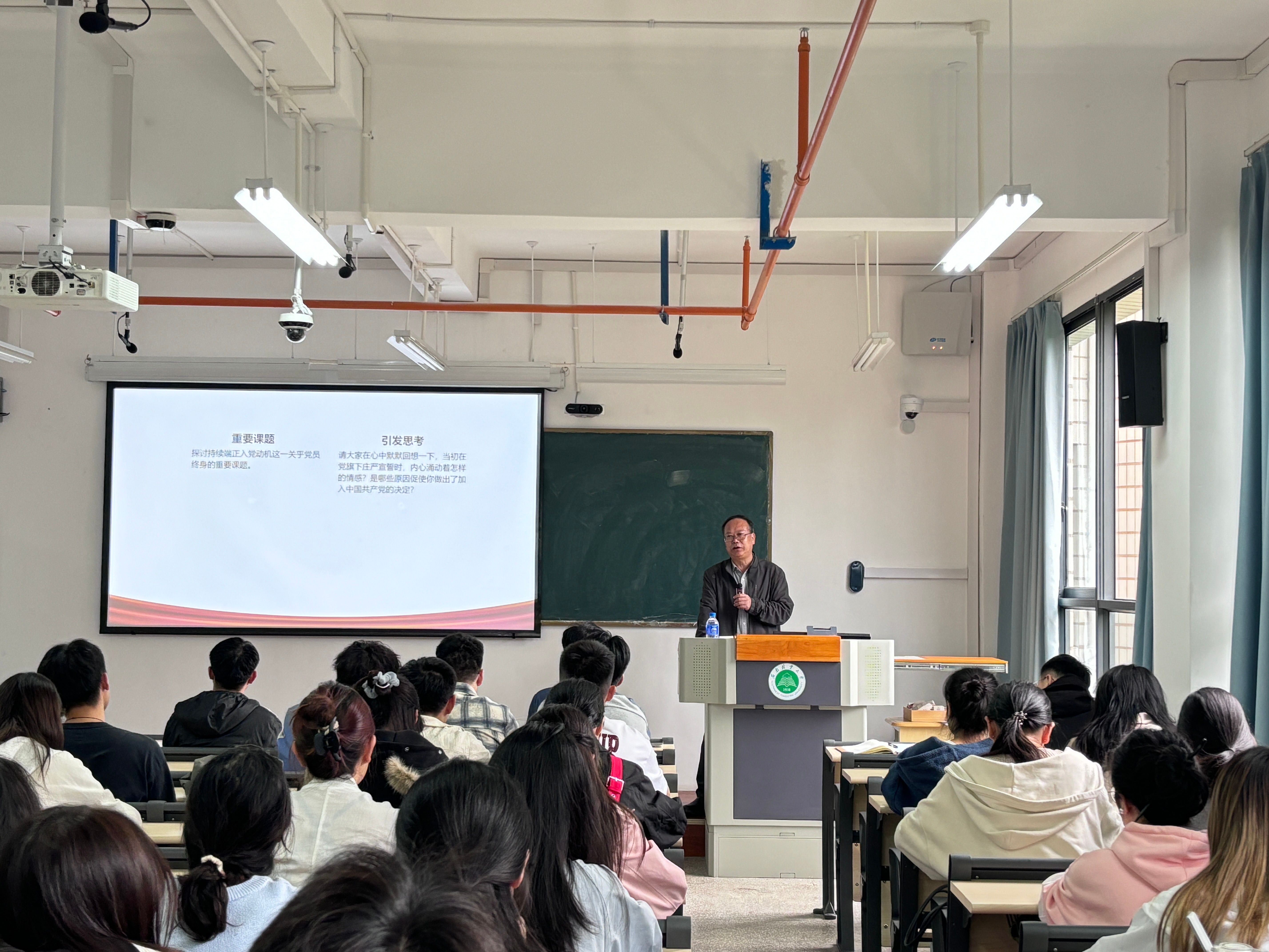 为深入学习贯彻习近平新时代中国特色社会主义思想,进一步加强党员队伍建设,引导广大党员深刻理解入党动机的核心要义,切实筑牢信仰之基、补足精神之钙、把稳思想之舵,10月17日,9728太阳集团组织开展了以“不忘初心 牢记使命——持续端正入党动机的终身实践”为主题的专题党课。党课由学院一级组织员林开文主讲,全体师生党员参加了此次学习。