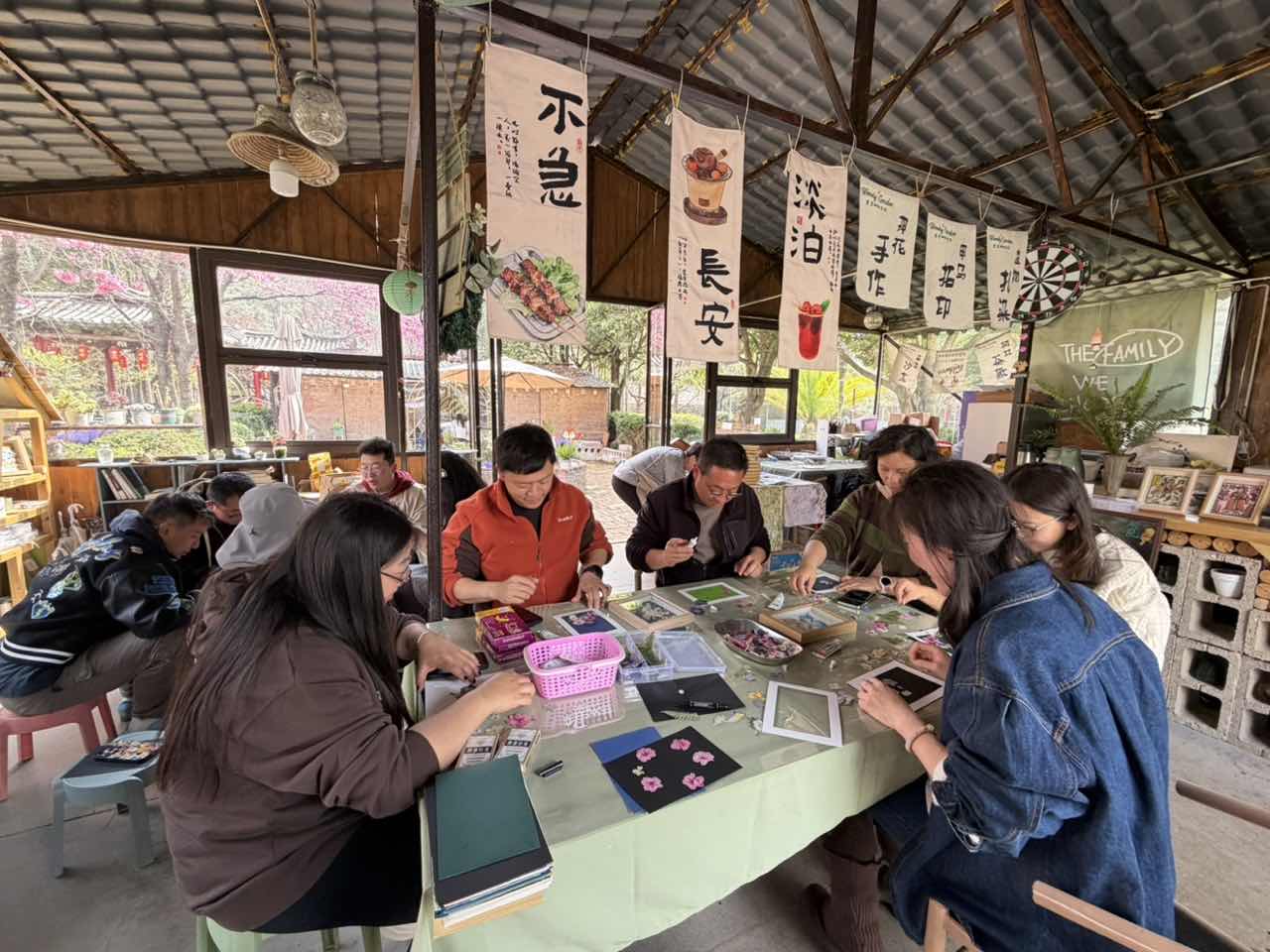 老师们在营地参与压花画制作活动,在压花画制作环节中,大家将采集到的花瓣、叶片等自然素材进行创意组合,制作出一幅幅独具匠心的压花作品,既锻炼了动手能力,也感受到自然与艺术的融合之美,老师们一边围炉煮茶,一边分享自己的压花画作品,茶香袅袅,炉火暖暖,大家围坐一堂,品茗谈心,享受着春日午后难得的宁静与温暖。